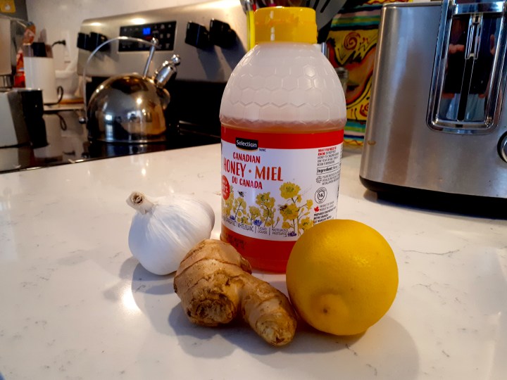 Half a lemon, 5 cloves of garlic, a hunk of ginger (about 2 inches) and honey (1-2 tablespoons to taste). All of these ingredients are antiviral/antibacterial.