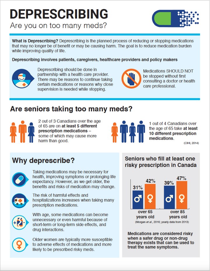 These infographics are a snapshot of the most important statistics about the use of risky medications and deprescribing; they are available in English and French. One version was created to raise awareness amongst members of the general public and another version was created for doctors and pharmacists. The brochure targets older adults who may have vision issues. A large font size and a bold typeface were used for this reason.