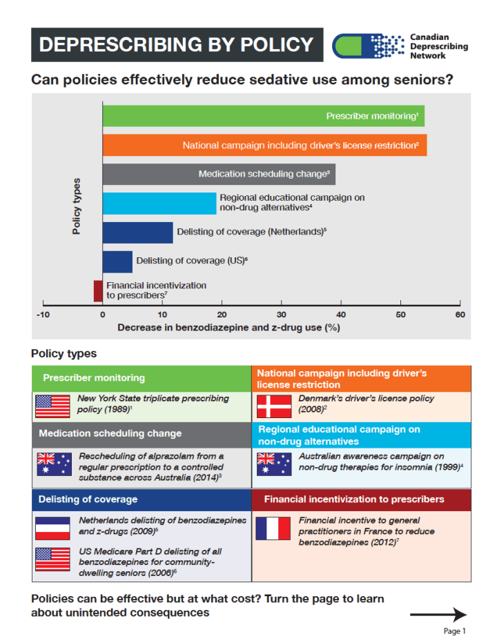 Infographic summarizing an analysis of health policies around the world reducing the use of sedatives and sleeping pills among seniors (front and back above).